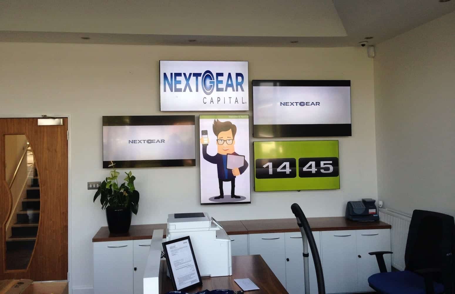 NextGear Capital moved to their new UK premises in September 2016 and wanted to make a real statement in their reception waiting room to wow their visitors and clients. A single screen just wasn’t good enough, and they wanted something a bit more artistic to complement their impressive interior design. They had a space, and also a photo of the video wall installed in their USA office as inspiration and asked for Teksmart’s help on what could be achieved.